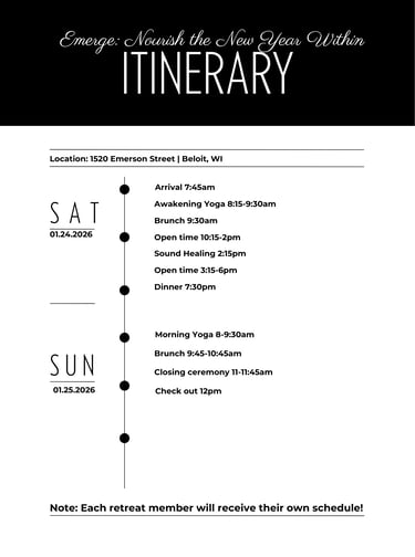 Emerge is a weekend wellness retreat in Beloit, WI starting Saturday January 24th at 7:45am & ending Sunday January 25th at 12pm. Enjoy yoga, meditation, massage, facial, sound bath, jacuzzi, nourishing foods and a vibrant community.
